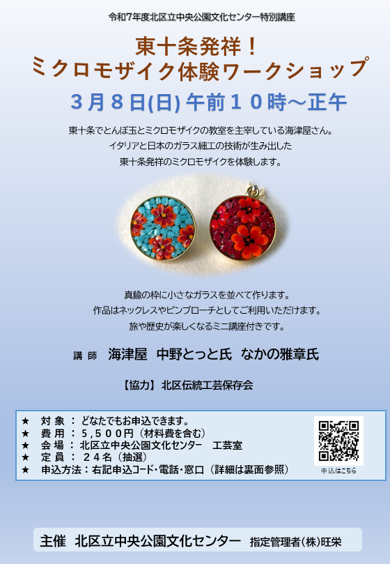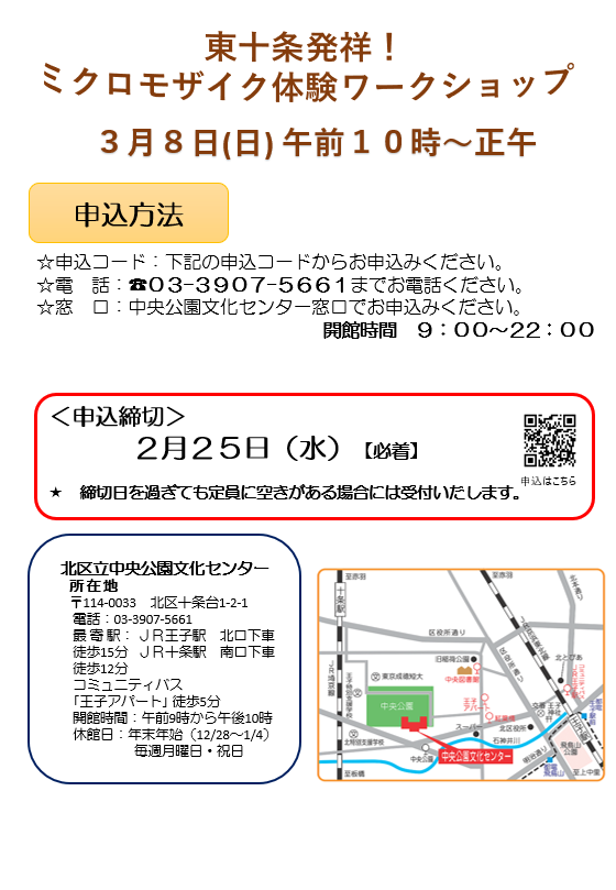 工房のある東十条のお隣、王子の歴史的な建物でミクロモザイクの体験を行わせていただきます。