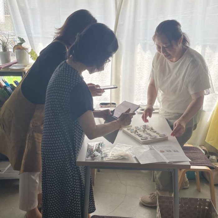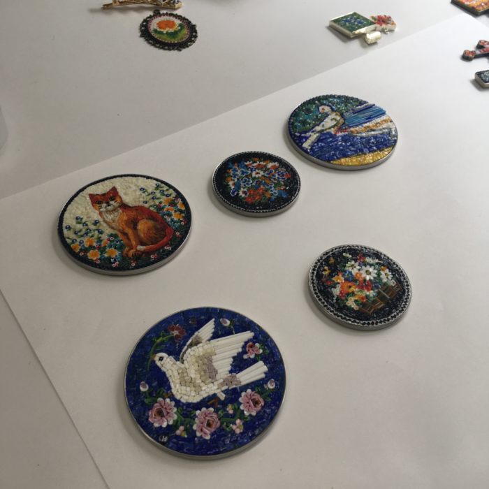 ミクロモザイクの一番の特徴として、ガラスパーツが手作りで同じように揃えることが難しいため、見本通りにはできません。海津屋では作品作りを通してどういう個性があるのか、「一人ひとりの良さ」を発見しそれを楽しむことを目標に指導しています。